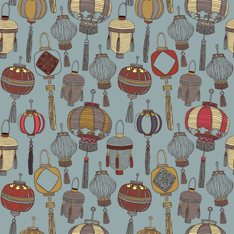 This design comes from the vault of our subscription boxes. Paying homage to the mid-autumn festival, this design features paper and silk lanterns and lucky coins. The lanterns are in hues of blue, mustard, burgundy, bright red and pink.